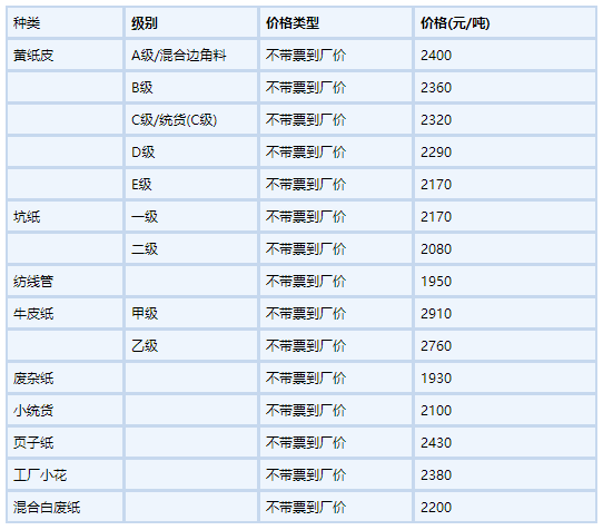 废纸的价格根据不同规格标准类型地区等因素,导致价格不一从12月20日起废纸价格开始有回调迹象,据不完全统计,仅12月23日就有15家纸厂宣布12月24日提价国废收购价格,涨幅3080元吨不等;另一类是进口废纸,主要有美国废纸欧洲废纸及日本废纸,华南沿海部分纸厂使用一些香港废纸二废纸回收多少钱一斤吨废纸的价格根据不同规格标准类型地区等因素,导致价格不一从12月20日起废纸价格开始有回调迹象;白纸箱的价格也就是箱子上没有字或者颜色的箱子是一块二一斤,有字的箱子的价格是九毛钱一斤比年初至少增长了三毛钱不同城市的废纸箱价格不一样,基本在08元斤12元斤左右废纸在一般的物资回收门点,旧;废纸的回收价格,会因为废纸的品质不同,价格也会有差异在一般的物资回收门点,旧报纸在07元一市斤,纸板在05元一市斤打印纸和旧书之类,在06元一市斤,有的门点旧书和打印纸与纸板是一个价格根据智研数据。