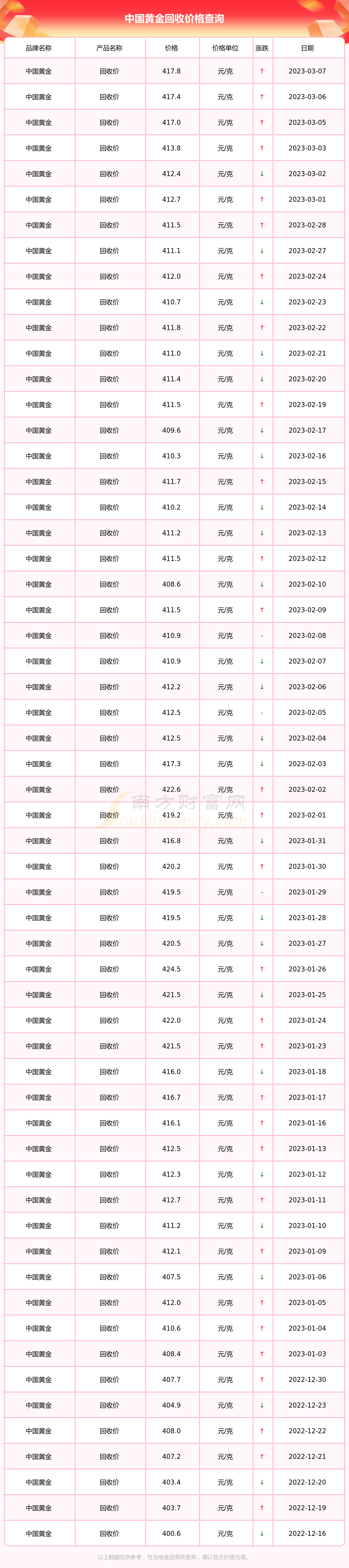 8、会根据查询金投网显示,自2023年11月1日起,国内各大金店的黄金价格普遍下跌,截止到2023年11月14日,金价小幅度回升。