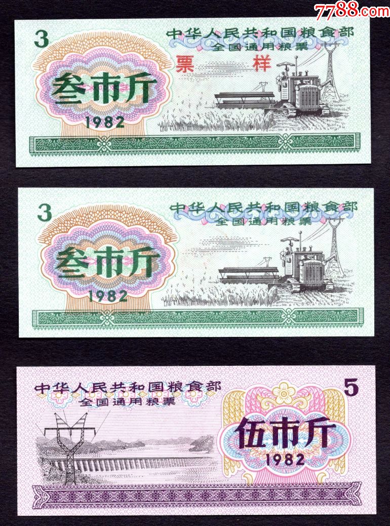 3、1982年版全套2枚,面额分别为3斤、5斤,此套粮票未流通使用,市场参考价为每套40元至50元。