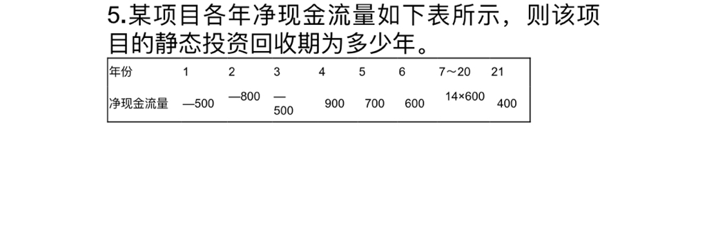 5、回收余额 1483 1029 634 301 剩余回收期为 第五年非整年 061301497所以回收期=4+061=461年 收益率=内含报酬率=内部盈利率20=71*pa,I,5+20*20%*pf;的投资在第三年可以收回,所以已经收了2年,在第三年收回前还剩2500没有收回静态投资回收期=2+2500÷7000=236年保留两位小数 或=2-1+2500÷7000=236年保留两位小数动态回收期的公式;计算公式N=KP式中N为投资回收年限年K为总投资额指全部建设投资加流动资金和利息万元P为企业年纯投入利润加折旧万元投资回收年限是“基本建设投资回收年限”的简称建设项目或单位工程自。
