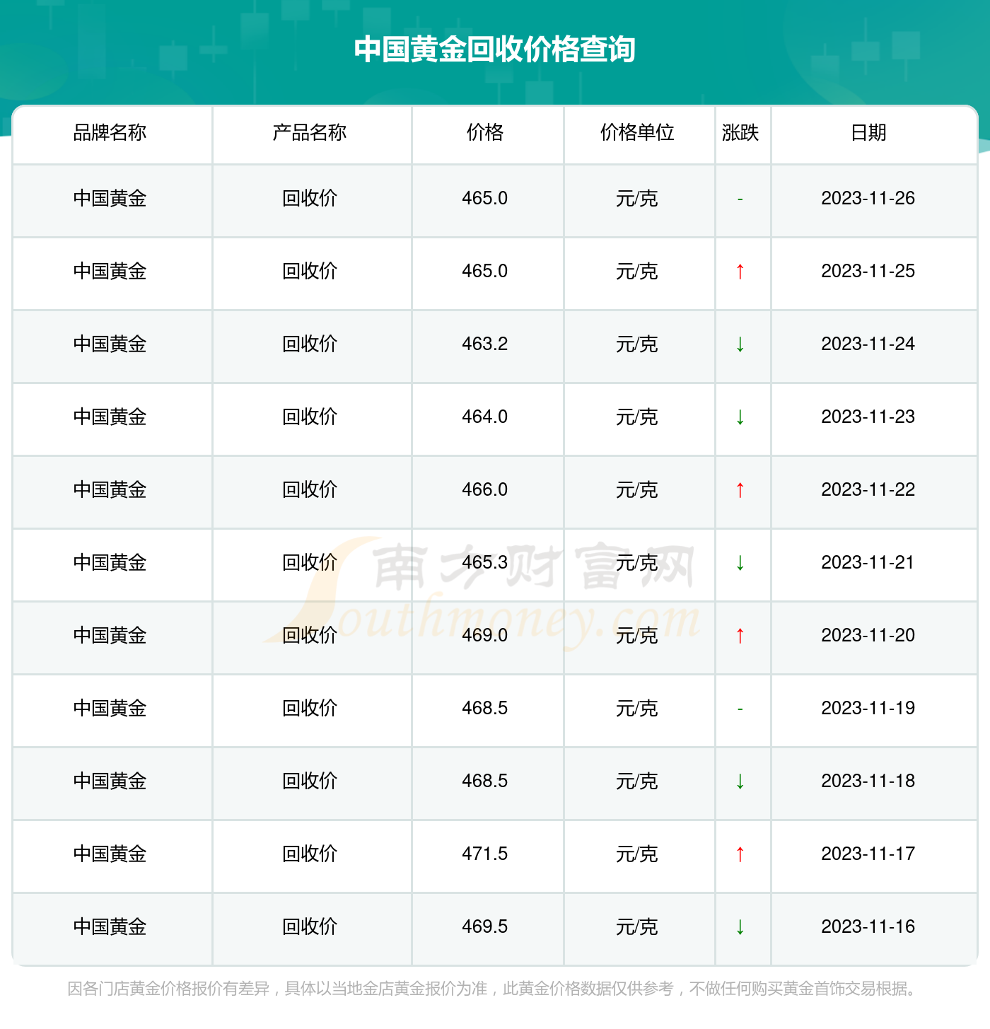 另外,投资者还可以直接在黄金交易所查询每日的黄金交易价格黄金交易所是一个集中进行黄金买卖的场所,投资者可以在交易所内通过交易席位或电子交易平台进行交易,同时获取实时的黄金价格信息无论是通过互联网还是直接在黄金;2019年12月9日10点30分黄金价格为33134元,12月9日,据中国外汇交易中心数据显示,与上周五12月6日相比,人民币汇率中间价下调了22个基点,报70405其实黄金回收价格问题是无法准确说明白的,因为市场上的黄金出售;每日黄金交易价格的查询可以通过多种方式实现,其中最常见的方式是通过各大财经网站和证券交易平台查询这些平台通常会提供实时的黄金交易价格,以及相关的走势图和数据分析工具,帮助投资者更好地把握市场趋势和投资机会另外;足金990和999回收价不一样足金990的含金量为百分之九百九十,而足金999的含金量则是百分之九百九十九,虽然两者的含金量相差不大,但其回收的价格还是有所区别的一般来说,含金量越高,其硬度也越低,由此可见999黄金要比;黄金的纯度是影响回收价格的一个重要因素,通常以千分比表示纯度越高,黄金的价值就越高在黄金回收过程中,商家为了确保交易的真实性,经常会对黄金进行熔烧来检验其真假这是因为通过外观很难分辨出镀金产品,而真正的。