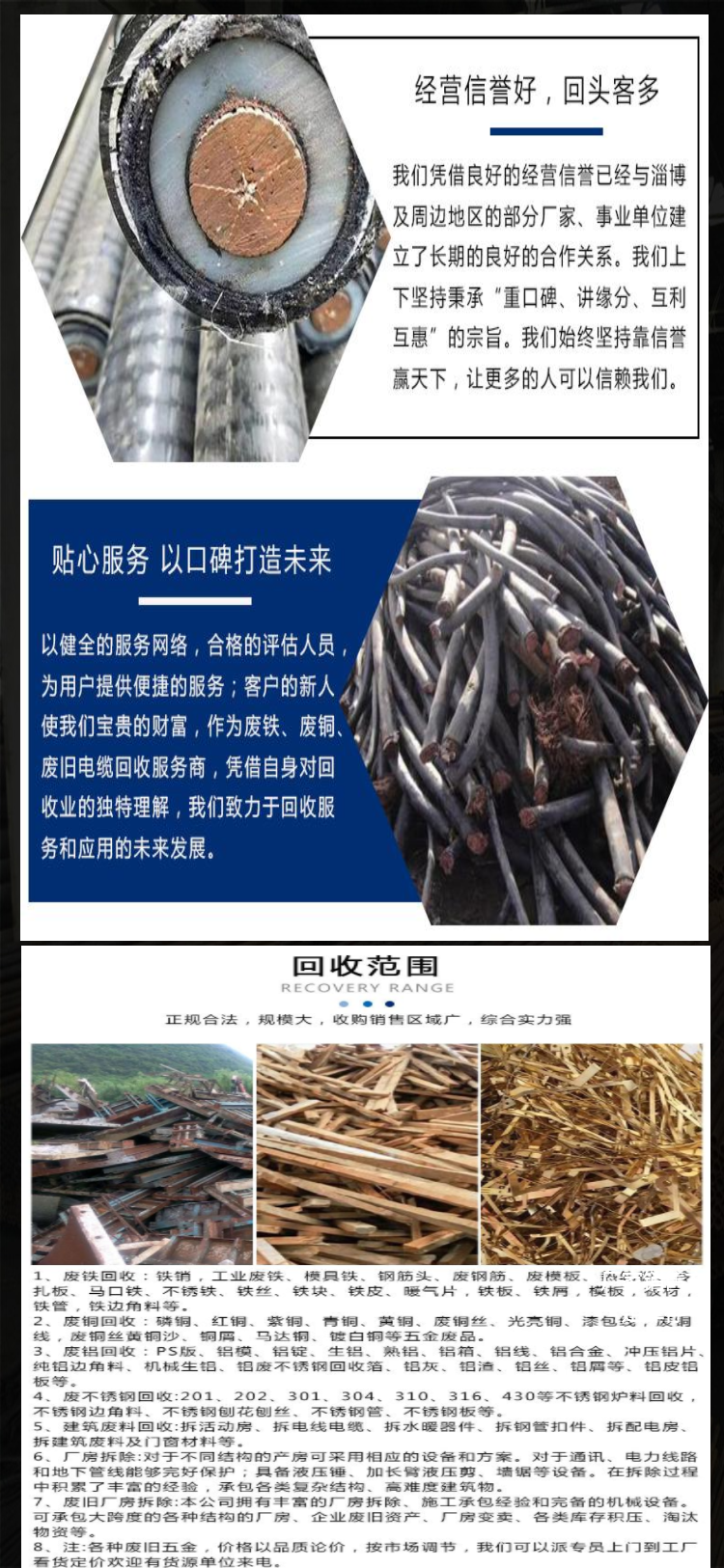 上门回收电线电缆 但对于重量较大的电缆电线,因为体积和重量的问题,无法快捷轻巧的移动,一般是上门回收和称重的,大家可以不用担心等待回收的电缆 尤其是资质健全和有实力的回收企业,一般都是全国上门进行回收的,在回收;以恪守诚信为本重信誉守承诺24小时上门回收安全快捷高效上门拉货并配带工人,并严格为客户保密并价格合理本公司高价回收各种废旧金属废铜,变压器,配电柜,电缆,电机,锅炉,中央空调等。
