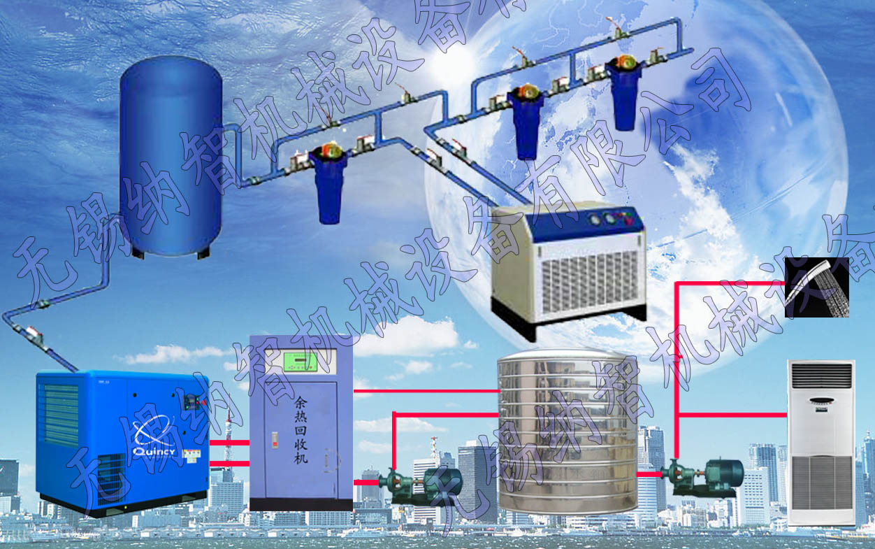 5、绿色环保,节能减排。热水机组完全利用空压机余热产生热水,无污染、无噪音、无碳排放、无黑烟、无油污。