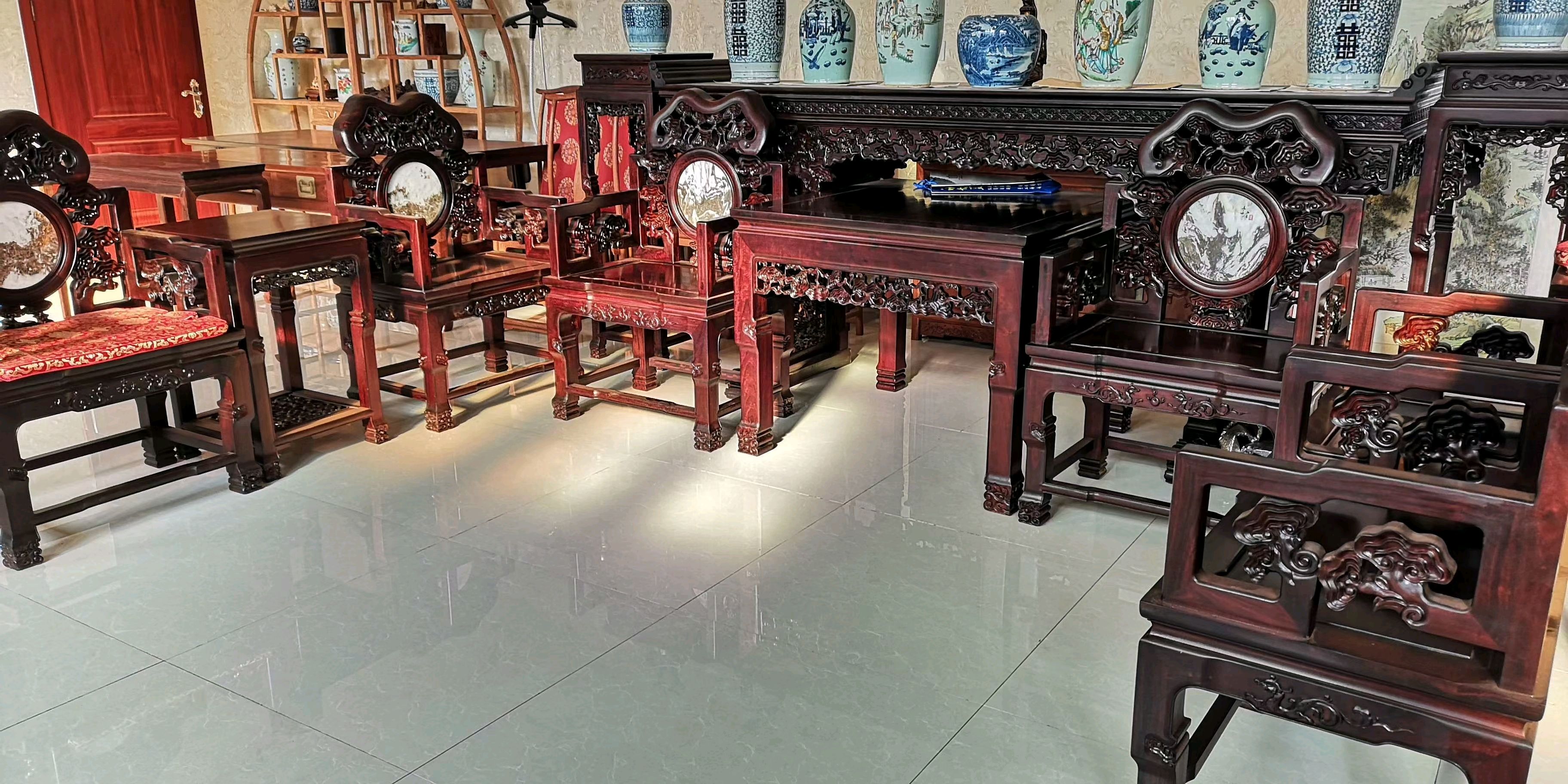 (一套大红酸枝木家具,价值近百万。邱凌峰 摄)