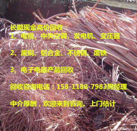 6、废旧金属废旧钢铁铜铝不锈钢及有色黑色贵重金属原材料等 变压器回收油侵式变压器,干式变压器,电力变压器回收,高低压配电箱回收等,电线电缆回收 中央空调回收二手溴化锂中央空调机组,热泵机组,冷水机组,110匹空调,挂壁机,柜机回收等 石家庄呈祥废旧物资回收公司。