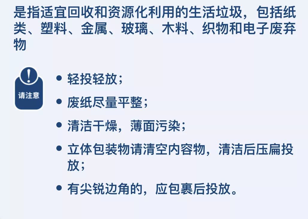 主要包括废纸,废塑料,废金属,废包装物,废旧纺织物,废弃电器电子产品,废玻璃,废纸塑铝复合包装等这里特别要指出的就是废纸,指的是废弃的非水溶性纸类完成这三种垃圾的分类,剩下的垃圾就可以放入“不可回收物。
