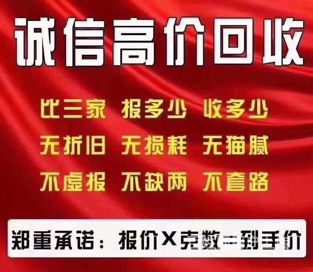 贵金属‘’回收:黄金(手镯、手链、项链、吊坠、耳环、耳钉、黄金摆 件、金条等),铂金(手镯、手链、项链、吊坠、耳环、耳钉、铂金条等),铂金、白银、钯金、白金、K金(工业废金 废料)。
