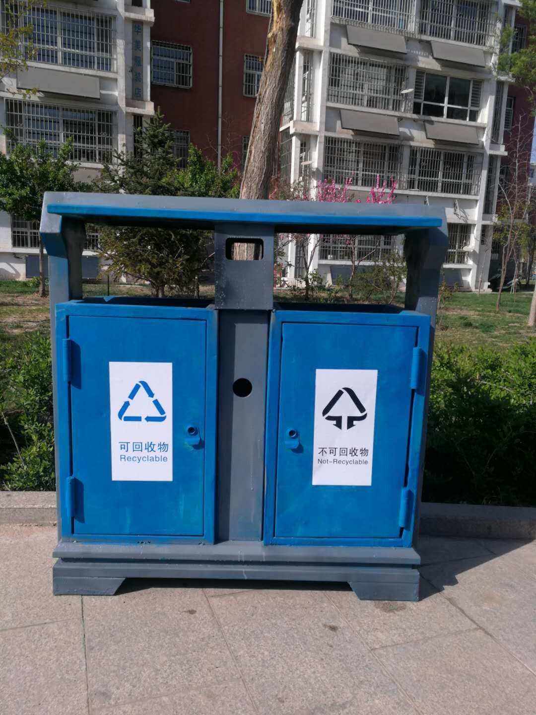 居民将可回收物扔到垃圾收集点后,可回收物被送到终端处理机构,细化分类打包压块,最终送到对应的厂家进行资源再利用分类垃圾桶 回收过程中,将可回收物再分为铁塑料类纸壳包装类纸类,纸类还会再细分为书本。