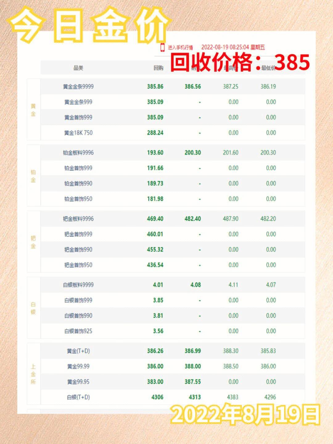 黄金回收价格查询今日428元克,铂金回收价格188元克,钯金回收价格289元克,18K金回收价格310元克周大福今日金价576元克,六福黄金今天交易价576元克,周生生今日金价572元克,金至尊黄金金价今日价格576元克。