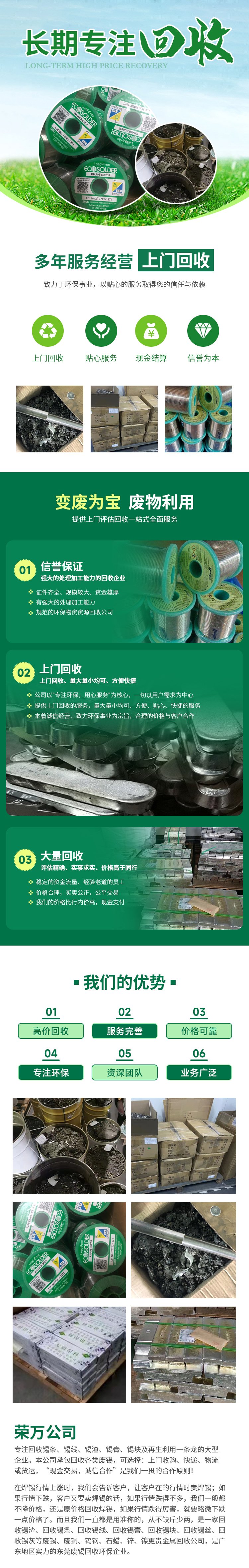 废锡的回收市场价是根据多种因素来决定的,包括废锡的纯度形态数量以及市场供需情况等一般来说,废锡的回收价格在每斤10元至30元之间然而,这只是一个大致的范围,实际的回收价格可能会有所不同因此,如果您有废锡需要回收,建议您与当地的废品回收站或废金属回收企业联系,以获取准确的回收;具体到废品分类,回收站会处理包括废铜废电线电缆废不锈钢废铝废锌废铁废锡等在内的多种废料这些废料不仅来自工业生产,也来自日常生活例如,废铜可以是从旧电线中提取的,废不锈钢可以是从旧餐具中收集的这些废品在回收站经过分类整理和处理后,将被重新投入市场,或者用于生产新的产。