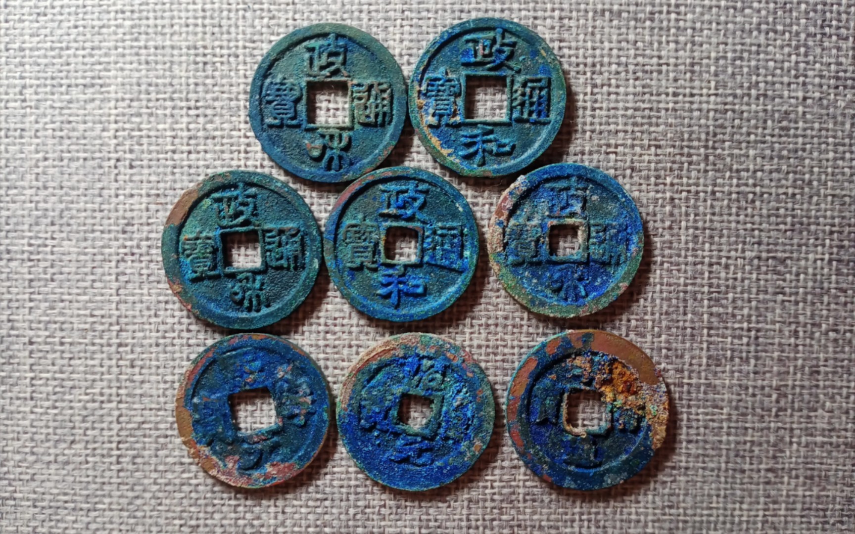 4、真钱币的红绿锈经过长年累月腐蚀,深入内部,因此粘力强,伪品的锈蚀是短时期制作上去的,比较易脱落。用指甲一扣可以分晓,如果有可能把钱币放入水中烧煮30分钟,伪币的锈脱落。