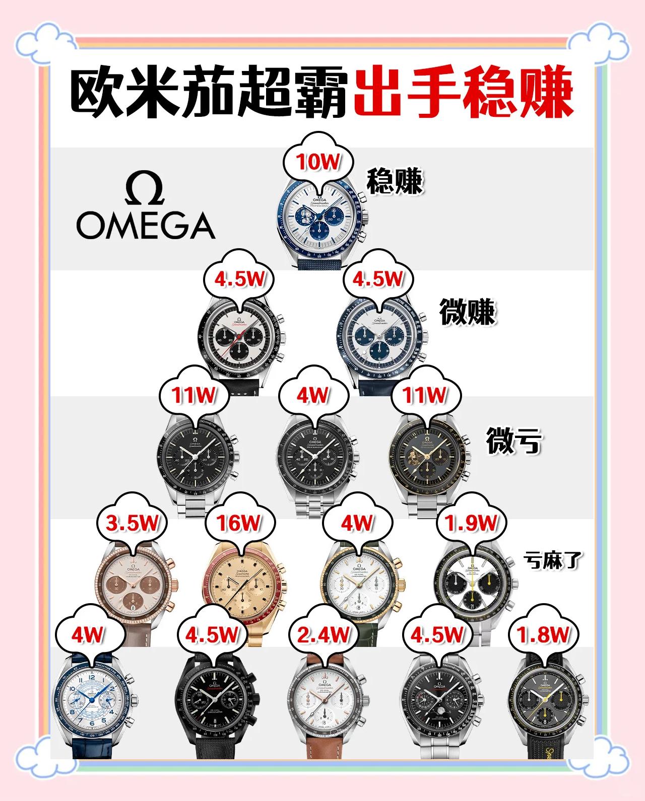3 、销售价格的识别 欧米茄价位均在1000元以上,高达几万元。美国代购的欧米茄手表会比专柜价格优惠一些,大概是专柜的6折到7折。欧米茄是瑞士首屈一指的制表厂商, Omega 手表无论是 男表 还是 女表 都很受大家欢迎。
