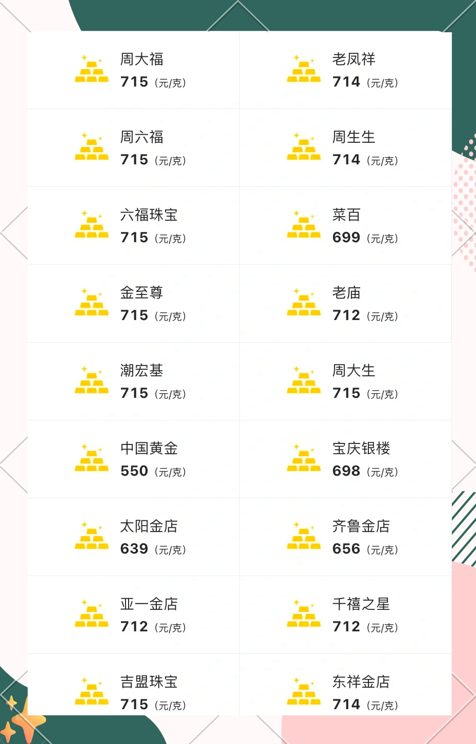 以上就是小编给大家整体的今日各品牌黄金价格的信息,希望能给大家有所帮助,数据仅供参考,具体请按照各门店为准想了解更多消息可关注巴中在线(www.cnbzol.com)。