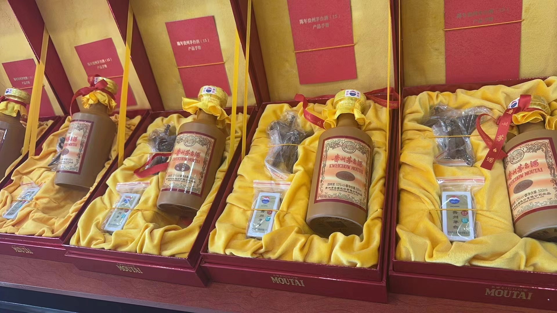 他们这里有2013年的贵州飞天茅台酒,有2009年的贵州茅台酒以及2015年的。另外还有贵州的年份酒,就是所谓我们说的十五年或者三十年的酒,以及四色的一个茅台酒。